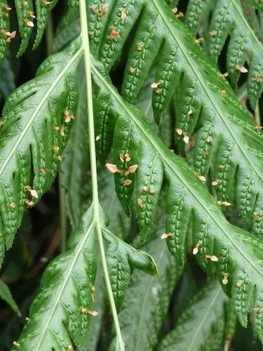 小高い山の小さな小川沿い、北向きの斜面に大きなシダが生えていた。葉の長さは1.5mほど。おおきい!大きいシダは、南国にきた気分にさせる。