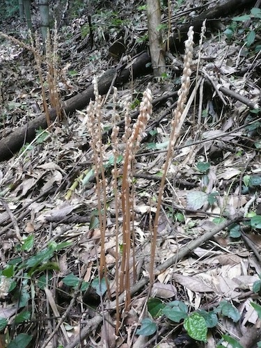 職場の自然系講座に参加されている方が自主的に山を調査されていて発見されました。残念なことに花は終わりかけ。白っぽい色をしているのは、この植物が光合成に必要な緑色の色素(葉緑素)を持たず、菌類と共生し栄養をもらっていきているため。地下にはジャガイモのような部分があり、ここで菌と共生しているのでしょう。