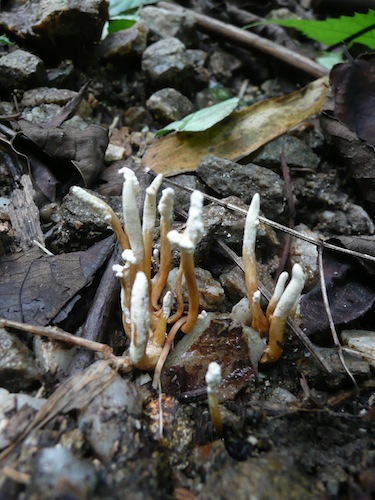 | イヌホタルイの花穂。三角で示したところはめしべで先は二つに分かれている。 |