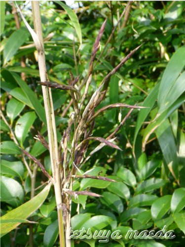 背の高いササの節から紫色がかった穂がでて、ところどころに黄色味がかったおしべがのぞいている。