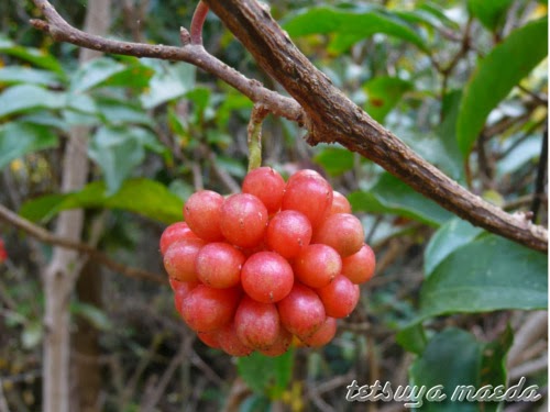 これはクサギの実。クサギの名は・・・音から想像される通り・・・臭い木だから「臭木」。葉をちぎって揉んだりすると、確かに臭いですわ。でもこれを自然観察会で子供にかがせた時、「ピーナッツのにおい!」という感想が出た。子供の発想もすごいし、「そうかも」と思って嗅ぐとそんな気がしてくるから、人間の感覚って不思議?