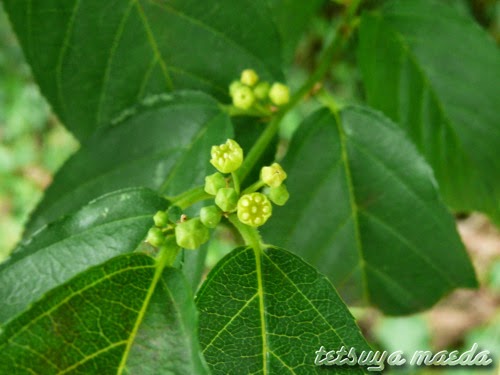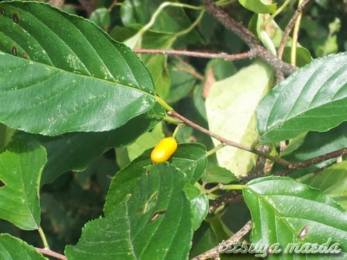 写真の幼虫が取り付いている木の枝は、ネズミモチ Ligustrum japonicum Thunb.というやはりモクセイ科の植物なので、この気を食べているのかも。しかし、この時はじっとしていて、食べている気配はなかった。