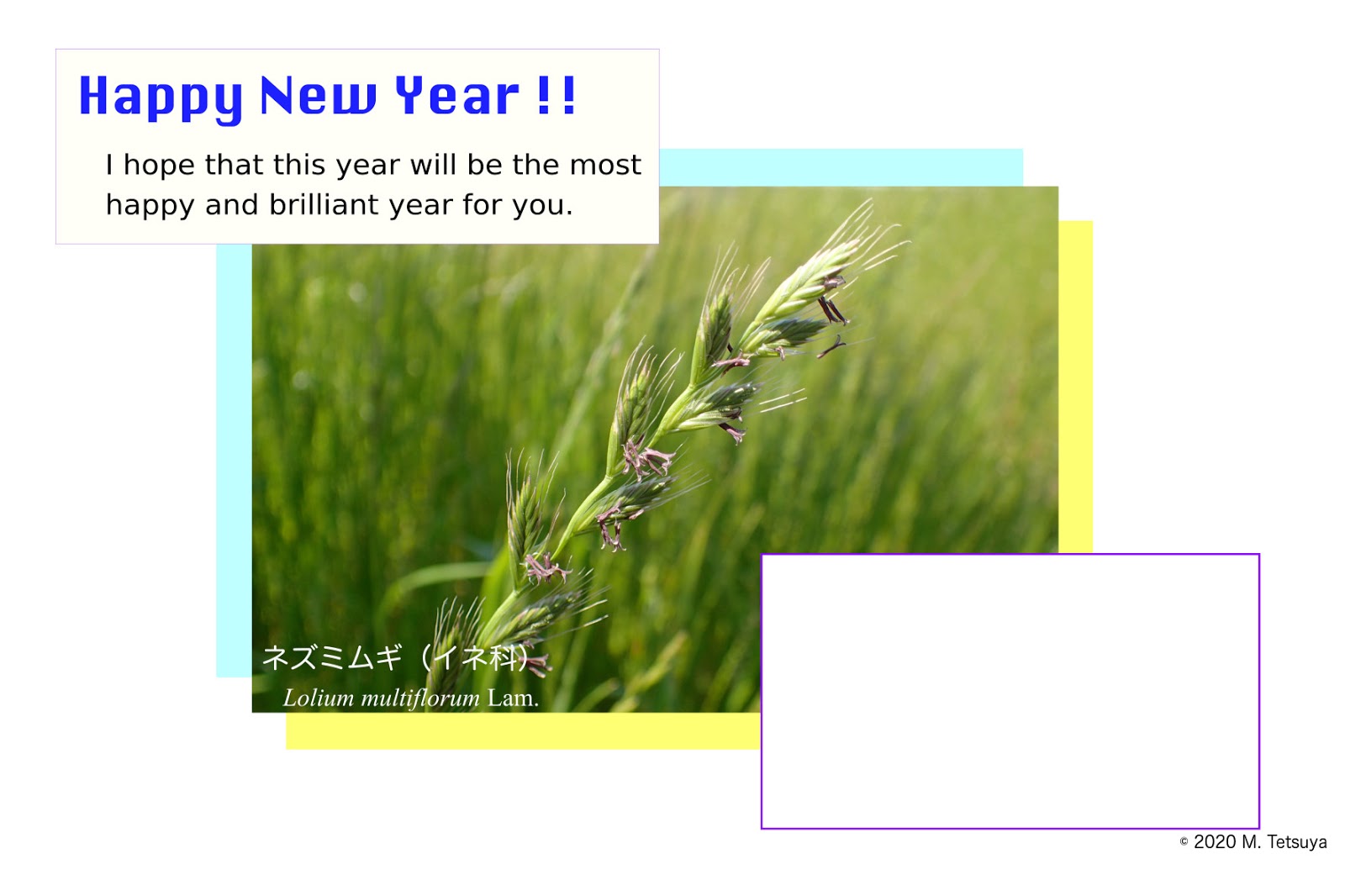 素材に使ったのは、子年にちなんで「ネズミムギ」。外来のイネ科植物です。形からざっくりとネズミムギと判断して保存していた画像です。これを作る段になって気づいたのが、葯(雄しべの先の花粉が入った袋)が紫色っぽい点。ネットで検索すると黄色い葯のものが引っかかってくるので、なにやら非常に不安に駆られるのですが、年賀状という時期が非常に限られるものなので、えいやっと作ってしまいました。